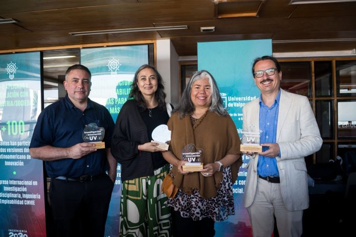 Rodrigo Salas, de Ingeniería Civil Biomédica; Patricia Martínez, de Ingeniería en Construcción; Ana Aguilera y Jean-Gabriel Minonzio, ambos de Ingeniería Civil Informática fueron distinguidos como “Investigadores destacados” en el marco del Encuentro “Sinergias que proyectan: la transformación de la UV en acción”.