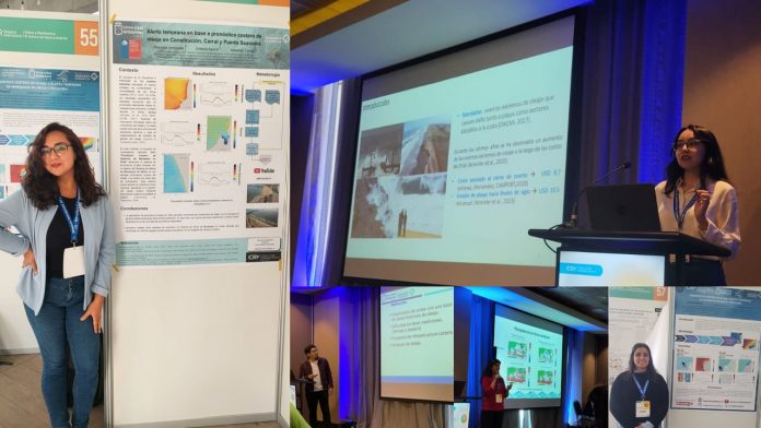 Magdalena Vásquez presentó el tema «Caracterización sinóptica de eventos extremos de oleaje en Chile», mientras que Almendra Hermosilla hizo lo propio con el póster «Alerta temprana en base a pronóstico costero de oleaje en Constitución, Corral y Puerto Saavedra».